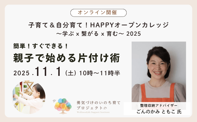 2025年度の第8回目の講座は、11/1(土)『簡単!すぐできる!親子で始める片付け術』をオンライン開催します。